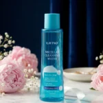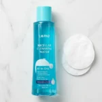 Take an adequate amount of micellar water on a cotton pad and gently wipe your face, eyes, and neck to remove makeup and impurities.