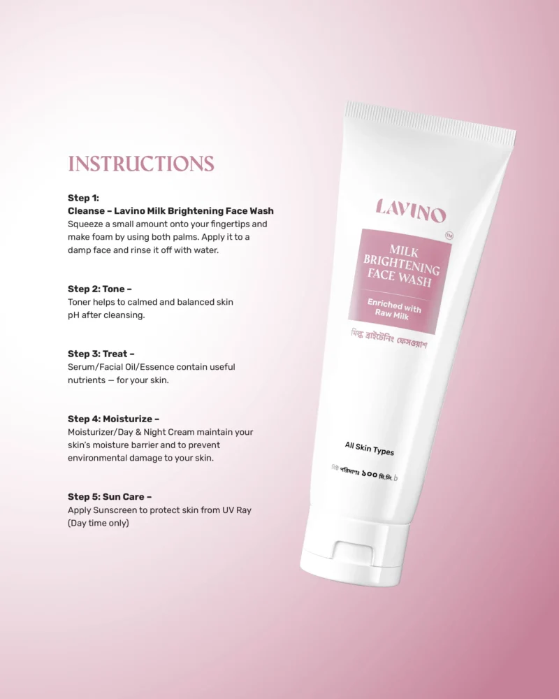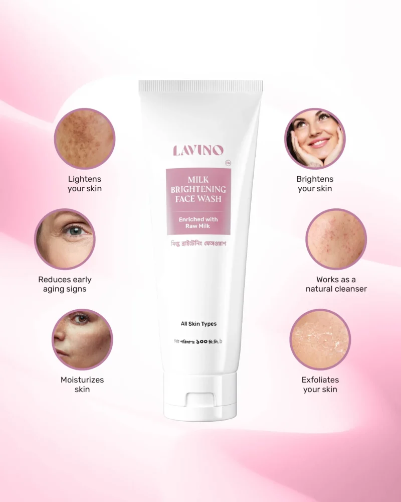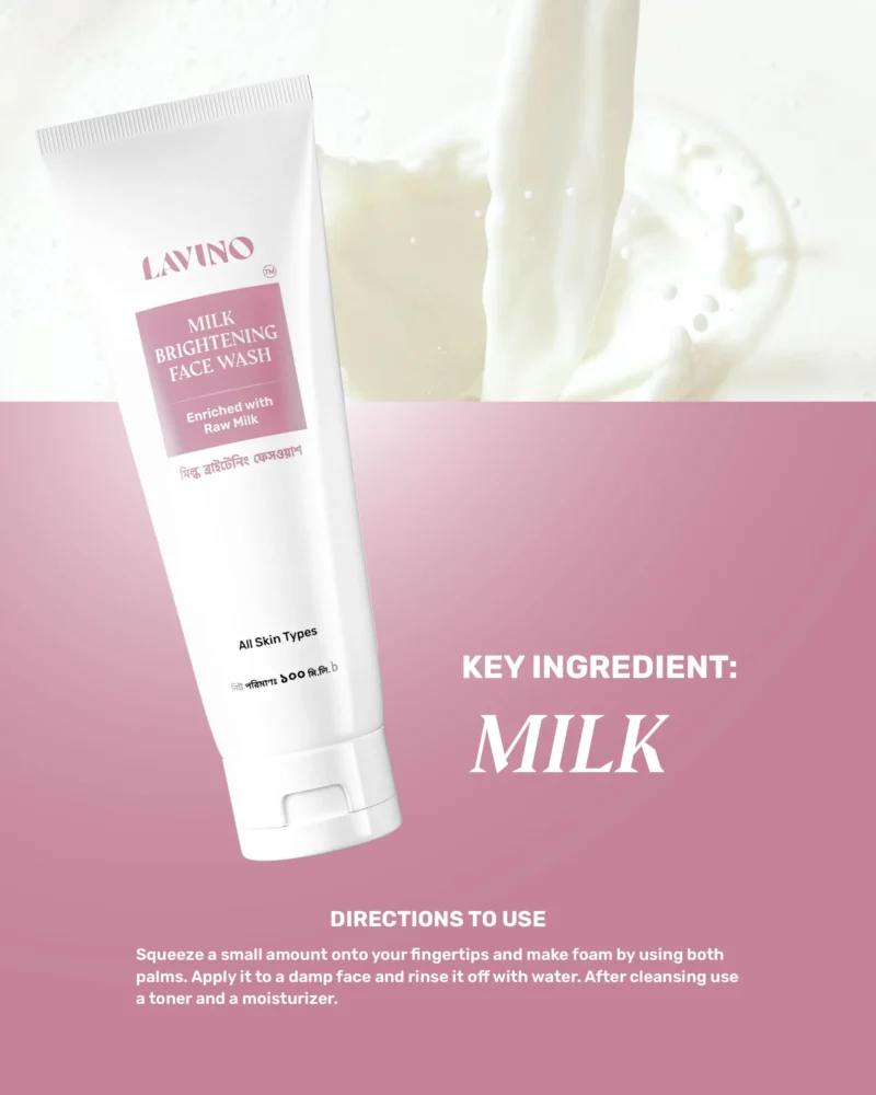 Ultra-soothing and super nourishing Lavino Milk Brightening Face Wash deeply cleanses dirt from the skin. It consists of milk. Milk contains lactic acid, a natural and mild exfoliator that helps to remove dead skin cells to make spotless, moisturized, and brighter-looking skin.