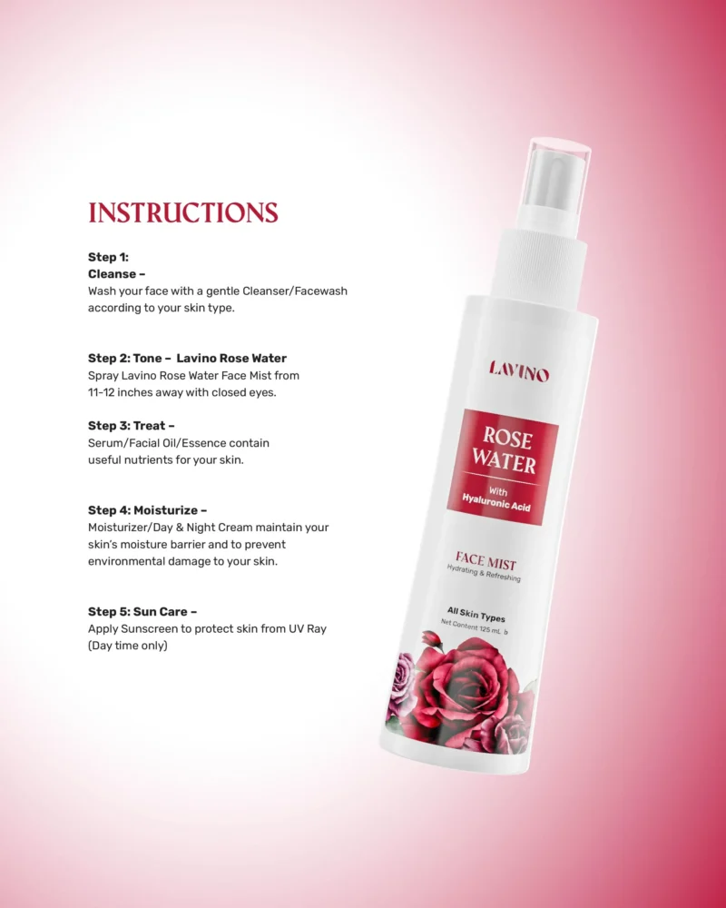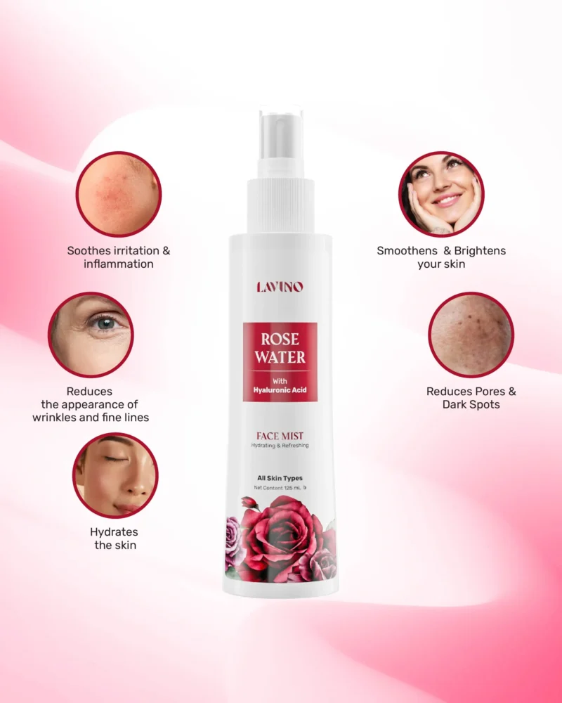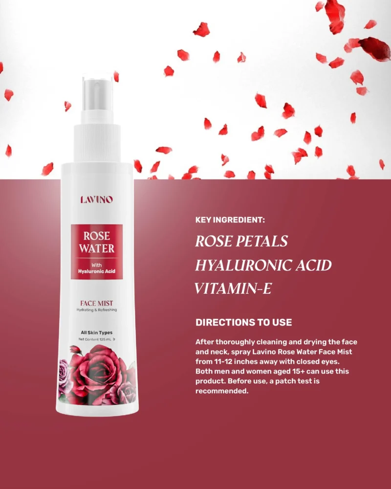 Lavino Rose Water is made with the finest rose petals and distilled to perfection for a refreshing experience. Infused with the hydrating power of hyaluronic acid, it leaves your skin feeling soft, plump, and smooth. Pamper yourself with the lightweight texture of this face mist and indulge in a nourishing and aromatic beauty ritual.